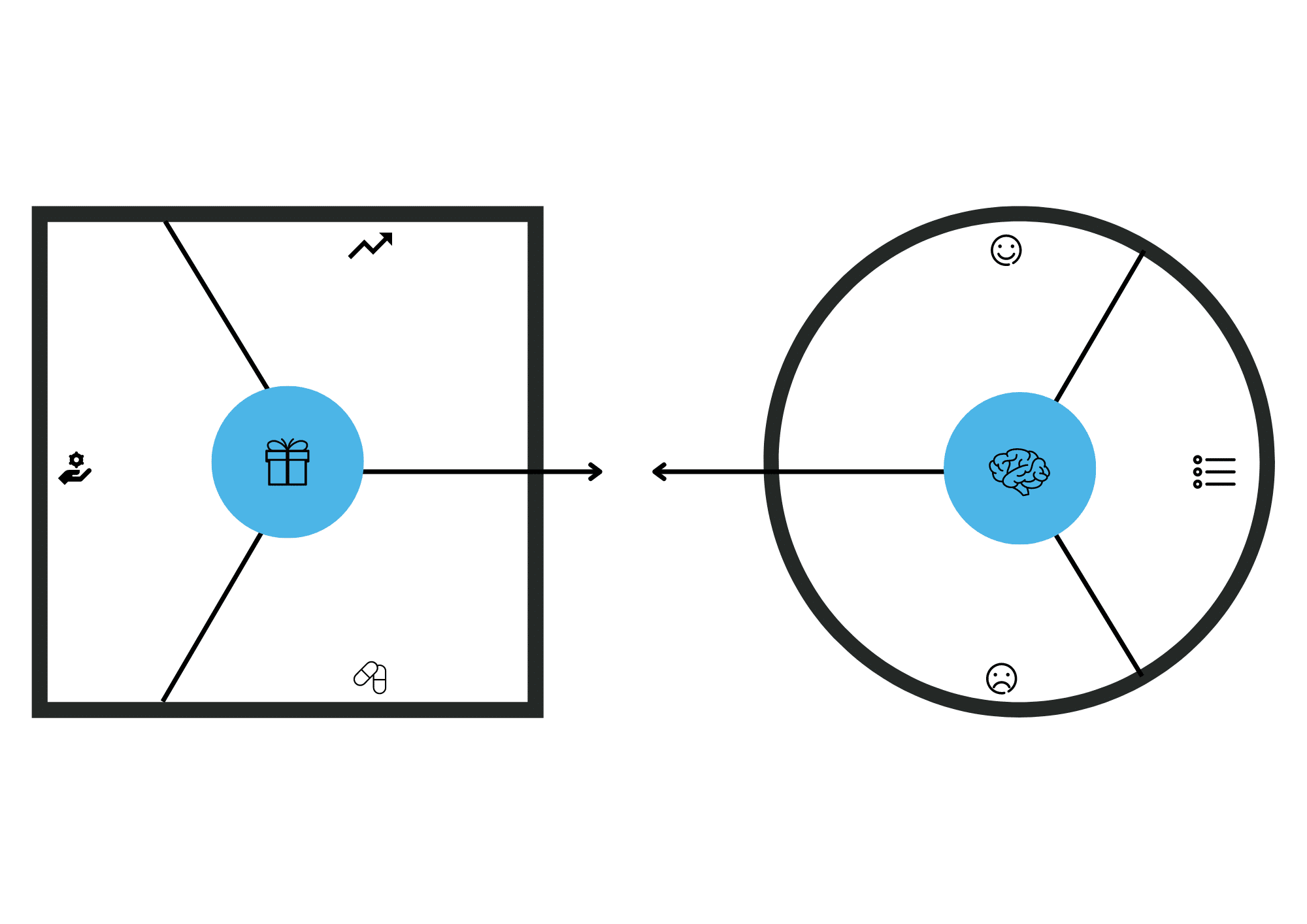 Laten we eerst kijken hoe het model is opgebouwd. Aan de rechterkant zie je het perspectief van doelgroep (Strategyzer noemt dit: klantprofiel). Links staat het aanbod van je organisatie uitgebeeld (de waardepropositie). De pijlen laten zien waar het om draait: het vinden van de match tussen aanbod en vraag.